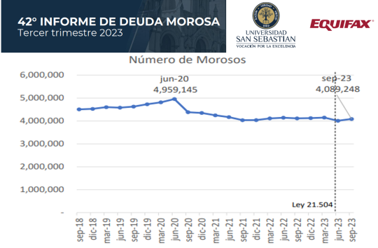 De acuerdo con el 42° Informe de Deuda Morosa que elaboran la Universidad San Sebastián y Equifax (*1), en el tercer trimestre de 2023 el número de deudores morosos aumentó a 4.089.248 personas, retomando la tendencia al alza luego de la implementación de la ley que prohíbe informar deudas en salud. La cifra subió un 1,9% con respecto al periodo anterior y disminuyó un 0,6% anual. Este incremento trimestral es el mayor desde junio de 2020, cuando se observó el peor registro de morosidad, en plena pandemia. Actualmente, el 26,4% de la población mayor de 18 años registra deudas impagas.