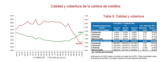 La cartera al día ascendió a $648.3b, esto representa el 95.4% del saldo total, mientras el indicador de calidad de cartera por mora para el total del portafolio, es decir, la relación entre el saldo vencido y bruto (Cartera con vencimientos superiores a 30 días) se mantuvo alrededor de 4.64% vs 4.55%a abril y 3,77% a mayo de 2022.