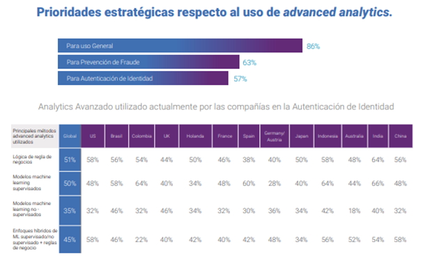De nuestra investigación relacionada con identificación y fraude en 2020 encontramos que el 86% de las compañías a nivel mundial declaran que aplicar técnicas de analítica avanzada para uso general es una estrategia prioritaria, sin importar el tamaño de las compañías. Aunque en algunos temas como en la prevención de fraude, que ha mantenido un crecimiento rápido y acelerado apalancado en la transformación digital, solo el 63% de las compañías consideran usar técnicas de analítica avanzada como inteligencia artificial como un factor importante en la prevención de fraude, y solo el 57% lo considera relevante en la identificación de los clientes. Aún menor es el porcentaje de aquellos que están activamente en la búsqueda híbrida de métodos de machine learning para modelos supervisados y no supervisados, para mejorar lógicas del tipo reglas de negocio – el 45% globalmente, Estados Unidos y Japón con un 58% como casos atípicos.