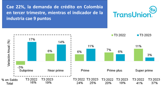 La desaceleración en la actividad económica y el consumo se tradujo nuevamente en deterioro de la demanda de crédito, que cayó 22% en el tercer trimestre del año, como consecuencia principalmente de las altas tasas de interés que hacen que la deuda sea menos asequible.
