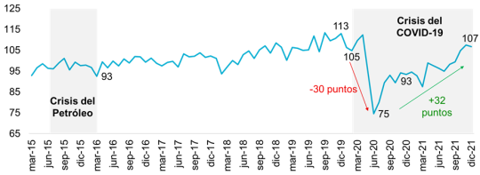 El crecimiento año contra año del IIC de diciembre de 2021 fue impulsado por el aumento tanto de la demanda como de la oferta de crédito, así como por mejoras en el desempeño crediticio. Si bien la demanda no ha vuelto a los niveles previos a la pandemia, las consultas, una medida del número de consumidores que está aplicando a nuevos créditos, aumentaron 25% año contra año en octubre de 2021.