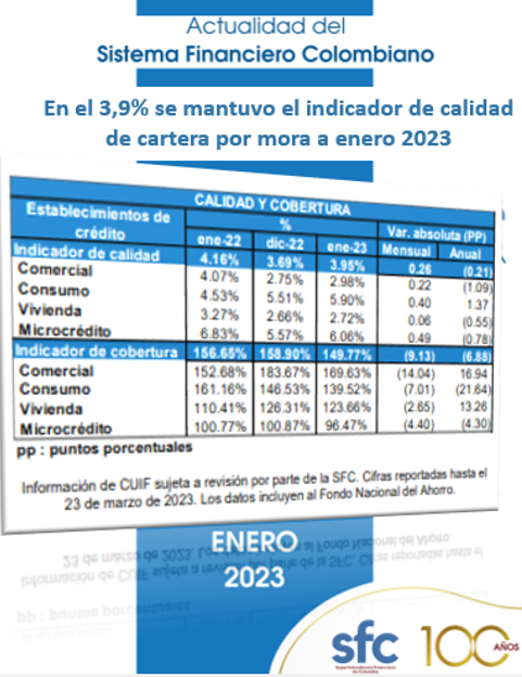 En el 3,9% se mantuvo el indicador de calidad de cartera por mora a enero 2023 en Colombia