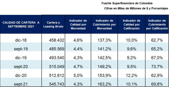 Del total de la cartera a septiembre de 2021, el 91.6% se constituye en cartera sin cambios ni modificaciones. El 6.3% se constituye en cartera redefinica en el marco del PAD; y el 1.7% redefinida por fuera del PAD y solo el 0,4% mantiene medidas vigentes de la Circular 7 y 14.