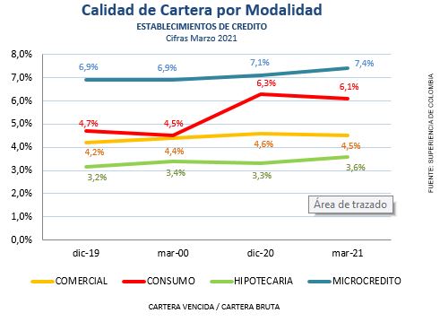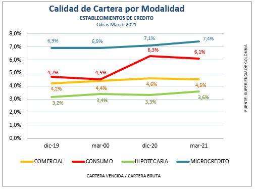 Por modalidad, el indicador de cartera vencida comercial cerró en 4.5% manteniendose estable frente a febrero; consumo en el 6.1%, bajando frente a febrero mes en el que se ubicó en el 6,4% ; la cartera vencida Hipotecaria cerró en el 3.6% mentaniendose de igual manera estable frente a febrero y la más deteriorada fue la cartera de microcredito con 7.4% de calidad por temporalidad, tambien estable frente a febrero.