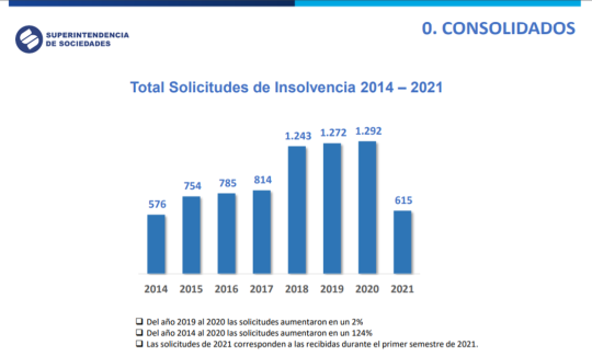 Durante lo corrido del 2021, la Superintendencia de Sociedades recibió un total de 615 solicitudes de Insolvencia, un 36% más de solicitudes, comparado con las que se presentaron en el primer semestre de 2020. Un 78,86% de las solicitudes corresponden a procesos de reorganización y un 21,14% a solicitudes de liquidación.