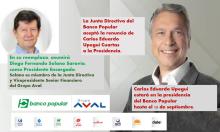 En su sesión del día de hoy miércoles 30 de agosto, la Junta Directiva de Banco Popular aceptó la renuncia por motivos personales presentada por el  Carlos Eduardo Upegui Cuartas a la Presidencia del Banco, cargo que ocupará hasta el 15 de septiembre del presente año.