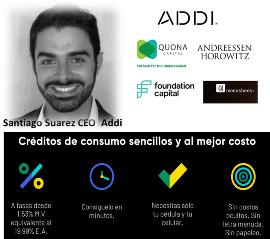 En la ronda de inversión la mayor tajada fue para Quona Capital con sede en Washington DC, quien también participa en el capital de Konfío y Creditas, ambas Fintech de crédito con sede en México y Brasil, respectivamente. En la Ronda de Addi también participaron Foundation Capital, que posee en su portafolio marcas famosas como LendingClub y Rappi, además de S7 Ventures. Y otros prestigiosos fondos como Monashees (VC de São Paulo) y Andreessen Horowitz firma estadounidense con sede en Menlo Park, California, que invierte tanto en start-ups en etapa inicial como en compañías de crecimiento establecido.