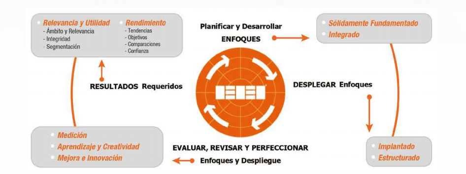 El modelo EFQM se explica mediante la alineación entre el adecuado liderazgo que se ejerce para las personas, la estrategia y las alianzas/ recursos. Pero es a través de los PROCESOS como se obtiene los resultados empresariales satisfactorios para las personas, los clientes y la sociedad; considerando el aprendizaje, la creatividad y la innovación como habilitantes fundamentales. Cada uno de estos criterios se evalúa en la organización y le permite determinar el nivel de madurez de la gestión, empleando la matriz REDER.