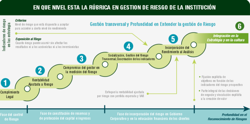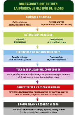 La gestión de riesgos incluye toda una historia evolutiva de fortalecimiento y aprendizaje de los comportamientos ante las complejidades de los riesgos que se asumen, y se refleja en la educación financiera de los clientes y de los funcionarios. Si bien la cultura de riesgos implica la incorporación de muchos atributos y valores de cada Banco dentro de un entorno socio económico es imposible de definir por solo indicadores. Estas seis dimensiones si pueden ayudar a una aproximación de la gestión de riesgos en una institución sin pretender en ningún caso ser la medida exacta de la cultura de riesgos.
