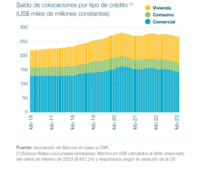 En marzo, el saldo de colocaciones totales de Chile alcanzó US$ 283 mil millones 1, donde la cartera comercial corresponde a US$ 151 mil millones (53%), las colocaciones de consumo a US$ 35 mil millones (13%) y la cartera hipotecaria a US$ 97 mil millones (34%) (Gráfico N° 1).