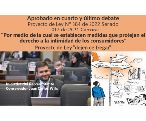 El pasado 19 de abril, fue aprobado en Sesión Plenaria de Senado el Proyecto de Ley Nº 384 de 2022 Senado – 017 de 2021 Cámara: “Por medio de la cual se establecen medidas que protejan el derecho a la intimidad de los consumidores”, más conocido por la Ley para "que dejen de fregar"