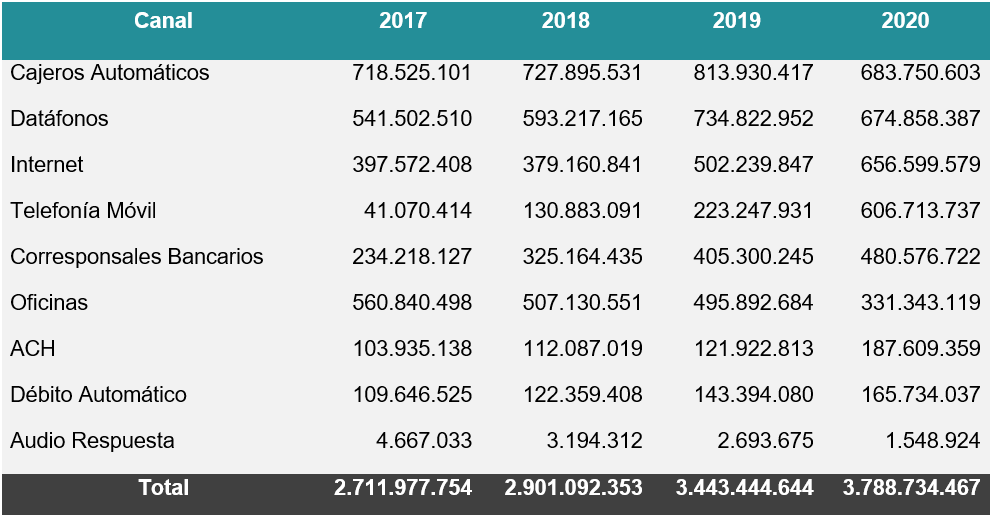 Como era de esperarse por medidas como las restricciones de movilidad  el confinamiento, se destacan los crecimientos del 47% y 19% que tuvieron la banca móvil e internet, respectivamente. En el primer caso la transaccionalidad subió de 3.568 millones a 5.230 millones y en el segundo de 1.678 millones a 1.997 millones.