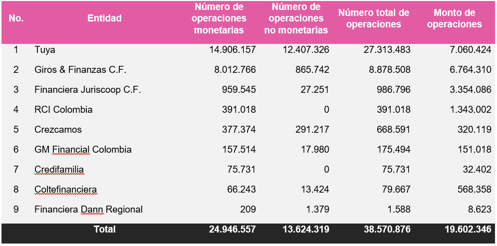 A su vez, las compañías de financiamiento reportaron 38.570.876 operaciones en el Segundo Semestre de 2020; 24.946.557 monetarias por $20 billones y 13.624.319 no monetarias. El mayor número de operaciones monetarias se registró en los datáfonos con 8.433.427 por $4 billones.