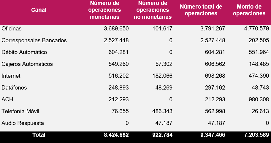 Respecto de las operaciones monetarias los crecimientos de la banca móvil e internet fueron del 172% y 31%, pasando de 223 millones a 607 millones y de 502 millones a 657 millones, respectivamente.