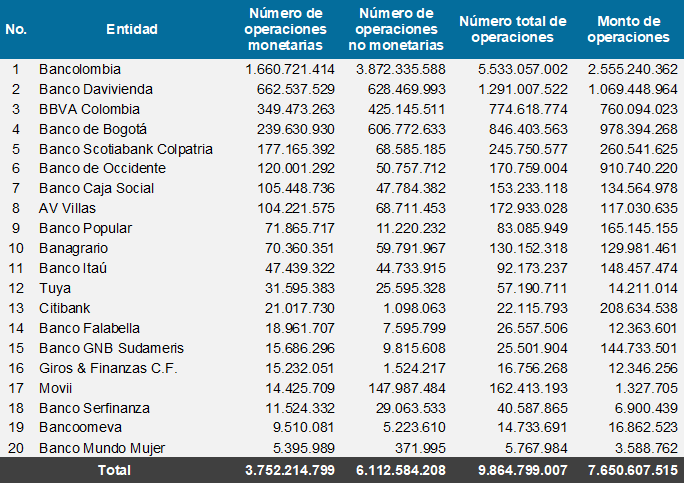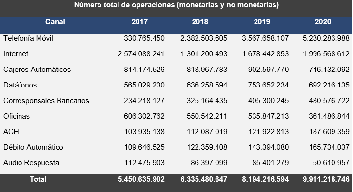 Según este informe, durante el 2020 el número total de operaciones realizadas por los usuarios del sistema financiero presentó un incremento del 21% respecto del volumen transado en 2019, al pasar de 8.194 millones a 9.911 millones (3.789 millones monetarias y 6.122 millones no monetarias).