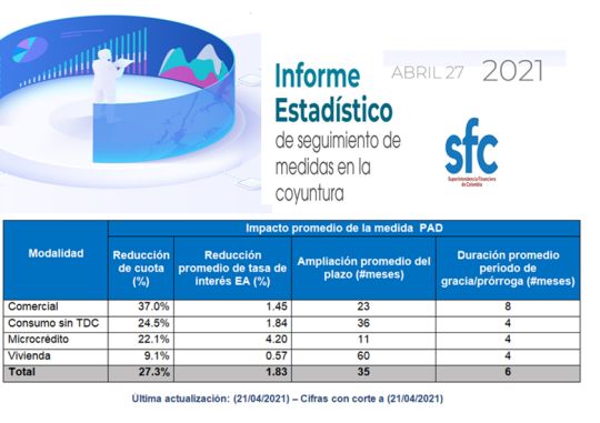 La persistencia del fenómeno COVID-19 y sus efectos en la economía han requerido un monitoreen permanentemente por parte de la Superfinanciera de Colombia, sobre la evolución de diversas variables que impactan los procesos de reactivación necesarios en el corto plazo, con el fin de adoptar las medidas necesarias para superar los retos derivados de esta coyuntura y mantener informado al público en general sobre la evolución de las mismas