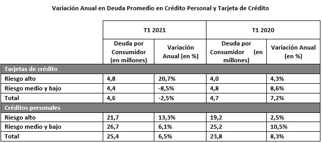 En el primer trimestre de 2021, el saldo promedio por consumidor en tarjetas de crédito se redujo un 2,5% año contra año, frente al crecimiento anual positivo del 7,2% observado en el primer trimestre de 2020. Mientras tanto, el saldo promedio por consumidor de los créditos personales aumentó un 6,5% en el primer trimestre de 2021, en comparación con el crecimiento anual de 8,3% observado en el primer trimestre de 2020.