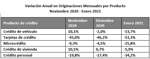 Las originaciones, que son una medida de nuevas cuentas abiertas y una señal tanto de la demanda de los consumidores como de la disposición de las entidades financieras a otorgar créditos, disminuyeron año contra año para todas las categorías de productos en enero 2021. Las caídas anuales más significativas en originaciones se observaron en tarjetas de crédito (53,3%), créditos personales (34,2%) y microcréditos (25,8%), lo que indica que los consumidores están siendo cautelosos a la hora de solicitar nuevos créditos y que las entidades podrían estar monitoreando la oferta de nuevos créditos con prudencia. Además, en enero se volvieron a implementar restricciones a la movilidad en Colombia para controlar el aumento de casos de COVID-19, lo que explica parte del deterioro observado en las originaciones durante ese mes.