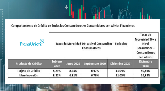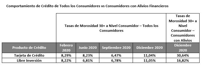En febrero de 2020, el 8,3% de todos los consumidores con tarjeta de crédito tenían 30 días o más de mora en el pago de esta obligación, mientras que el 8,2% de todos los consumidores con un crédito de libre inversión tenían 30 días o más de mora en el pago de este crédito. Ambos porcentajes mejoraron artificialmente durante algunos meses debido a los alivios, disminuyendo al 8,2% y 6,8% en junio de 2020 para consumidores con tarjetas y créditos de libre inversión, respectivamente, y al 6,5% y 6,8% en septiembre de 2020, también para tarjetas y libre inversión, respectivamente.