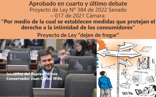 El pasado 19 de abril, fue aprobado en Sesión Plenaria de Senado el Proyecto de Ley Nº 384 de 2022 Senado – 017 de 2021 Cámara: “Por medio de la cual se establecen medidas que protejan el derecho a la intimidad de los consumidores”, más conocido por la Ley para "que dejen de fregar"