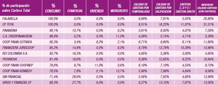 Revisemos en esta primera aproximación, hacia cuales segmentos de mercado dirigen sus esfuerzos y recursos las entidades crediticias en Colombia y cómo les va con la calidad de su cartera con esta mezcla de portafolio.