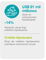 El flujo de crédito hipotecario sigue registrando una contracción anual. En efecto, el monto otorgado en el trimestre móvil de diciembre a febrero fue un 14% inferior en comparación con doce meses atrás. No obstante, en el margen se observa una estabilización en bajos niveles, siendo el flujo promedio mensual de los últimos tres meses (US$ 718 millones) similar al observado durante la mayor parte del año pasado (Gráfico N° 6).