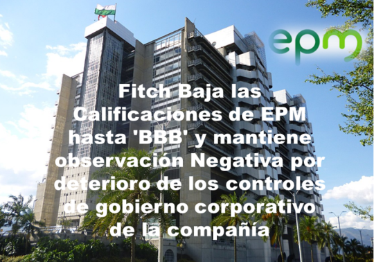 En su comunicado reseñado desde New York de fecha 13 Aug 2020, la Calificadora Internacional Fitch Ratings, bajó las calificaciones internacionales en moneda local y extranjera de Empresas Públicas de Medellín S.A. (EPM) hasta 'BBB-' desde 'BBB' y mantiene la Observación Negativa.