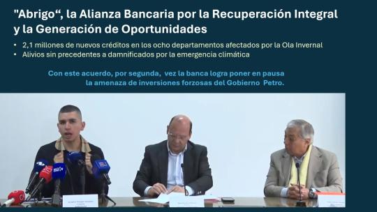 Bogotá, 11 de marzo de 2026. Asobancaria anuncia la suscripción de "Abrigo" (Alianza Bancaria por la Recuperación Integral y la Generación de Oportunidades), un acuerdo que constituye una alternativa a las inversiones forzosas para atender financieramente a los colombianos afectados por la emergencia climática, acuerdo que se da tras más de una docena de reuniones con el Ministerio de Hacienda y Crédito Público y la Superintendencia Financiera de Colombia, en las que también participó el presidente de la República, El programa entra en vigencia a partir del jueves 12 de marzo.