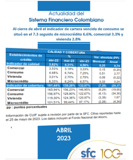 El indicador de calidad de cartera por mora para el total del portafolio, es decir, la relación entre el saldo vencido (Cartera con vencimientos superiores a 30 días) y bruto, paso del 4.3% en marzo al  4.6% en abril.  Para efectos comparativos, se debe tener en cuenta que en la mayoría de países de la región la cartera vencida se mide a partir de los vencimientos mayores a 90 días).