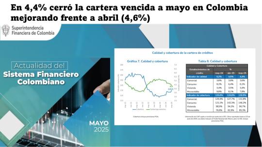 El indicador de calidad de cartera por mora en mayo, para el total del portafolio, fue de 4,4%, mejorando frente a abril de 2025, mes en el que cerró en 4,6% y mejorando sustancialmente en una mirada año corrido, ya que en mayo de 2o24, la cartera en mora se situaba en el 5,2%.  El Comportamiento por modalidad nos presenta un panorama tambien positivo:   Por modalidad, microcrédito reportó un indicador de 7,8% vs 8,1% de abril;   seguido de consumo que se situó en 6,1% bajando frente abril (6,4%); comercial en 3,6%  vs 3,8% de abril; y vivienda en 3,4% frente al 3,5% de abril . Todas las categorías mejoraron frente a abril.     Es de celebrar que hace mucho no veíamos bajar los indicadores de cartera en mora, el mismo mes,  en los cuatro tipos de cartera.