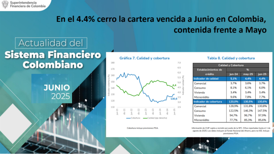 A cierre de junio, el indicador de calidad de cartera por mora para el total del portafolio, en el 4,4%, contenido frente a mayo.