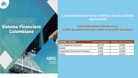 Las Cooperativas cierran con el 8.64% de cartera vencida a abril , muy por encima del indicador del sector, como quiera el indicador de calidad de cartera por mora para el total del portafolio de todos los establecimientos de crédito, calculado como la relación entre el saldo vencido y bruto fue de 5.24%, frente al 5,17% del mes de marzo y bastante alto frente al 4,55% de indicador de cartera que se tenía hace un año en abril de 2.023.