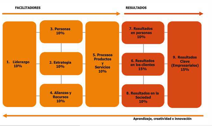 El modelo EFQM se explica mediante la alineación entre el adecuado liderazgo que se ejerce para las personas, la estrategia y las alianzas/ recursos. Pero es a través de los PROCESOS como se obtiene los resultados empresariales satisfactorios para las personas, los clientes y la sociedad; considerando el aprendizaje, la creatividad y la innovación como habilitantes fundamentales. Cada uno de estos criterios se evalúa en la organización y le permite determinar el nivel de madurez de la gestión, empleando la matriz REDER.