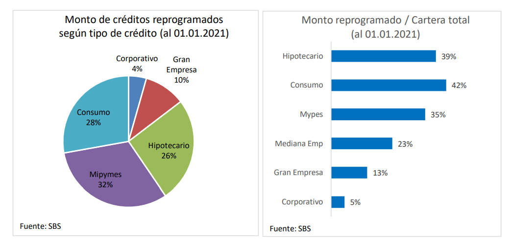 Asimismo, otra alternativa fueron las reprogramaciones, mecanismo que, a diferencia de los refinanciamientos y las reestructuraciones, se ofrecieron a los clientes que estaban al día al inicio de la pandemia, o que, como máximo, contaban con 15 días de atraso al cierre de febrero de 2020.