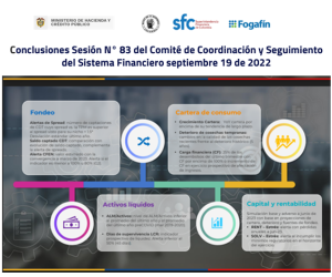 Durante la sesión 83 del Comité de Coordinación y Seguimiento del Sistema Financiero, llevada a cabo el 19 de septiembre de 2022 entre el Ministro de Hacienda y Crédito Público, el Gerente General del Banco de la República, el Superintendente Financiero y la Directora encargada del Fondo de Garantías de Instituciones Financieras – Fogafín, junto con el Director delegado de la Unidad de Regulación Financiera - URF, se analizaron las principales tendencias de los indicadores líderes del sistema financiero y las perspectivas para lo que resta de 2022.